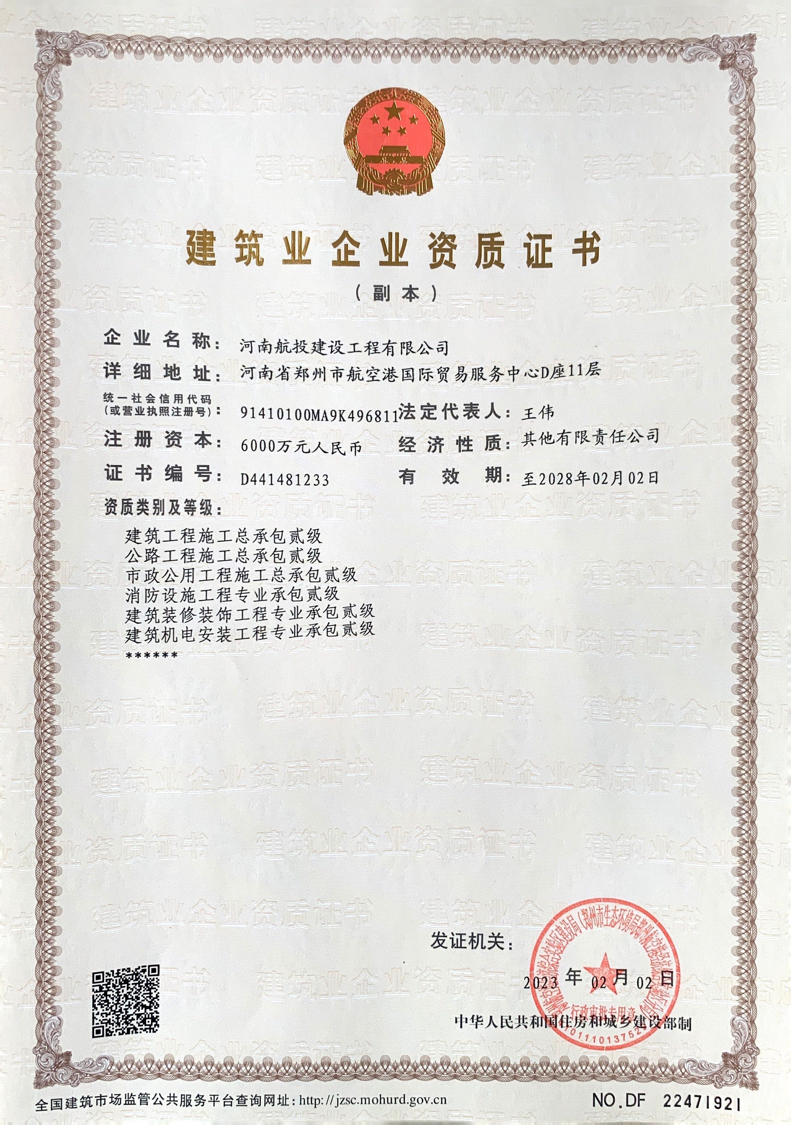 航投建工由河南航投集團(tuán)旗下河南航投航空基礎(chǔ)產(chǎn)業(yè)發(fā)展有限公司與貴州省場道工程有限公司共同出資成立。2022年9月28日,航投建工成功取得機(jī)場場道工程專業(yè)承包二級資質(zhì);同年12月8日通過河南省住建廳各項(xiàng)審核,取得《建筑施工企業(yè)安全生產(chǎn)許可證》,完成參與市場競爭的全部前置條件;12月23日,被評為鄭州航空港經(jīng)濟(jì)綜合實(shí)驗(yàn)區(qū)建筑業(yè)重點(diǎn)培育企業(yè),為施工總承包及多項(xiàng)專業(yè)資質(zhì)的取得打下堅(jiān)實(shí)基礎(chǔ)。
