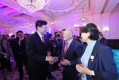 貝泰爾在招待會(huì)的致辭中簡(jiǎn)要回顧了商貿(mào)團(tuán)在北京和上海的交流情況,對(duì)參加招待會(huì)的各方代表表示感謝。致辭后,講臺(tái)上的貝泰爾看到張明超一行很是驚喜,立即向老朋友們舉手示意,并在隨后的自由交流環(huán)節(jié)與盧睿朗一起同張明超交談。
